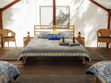 Upgrade to one of our luxe king-bed glamping units, featuring a comfortable king bed and elevated decor. We also offer family-friendly king-bed units that include additional twin and double beds—perfect for small groups or families seeking extra space and comfort.